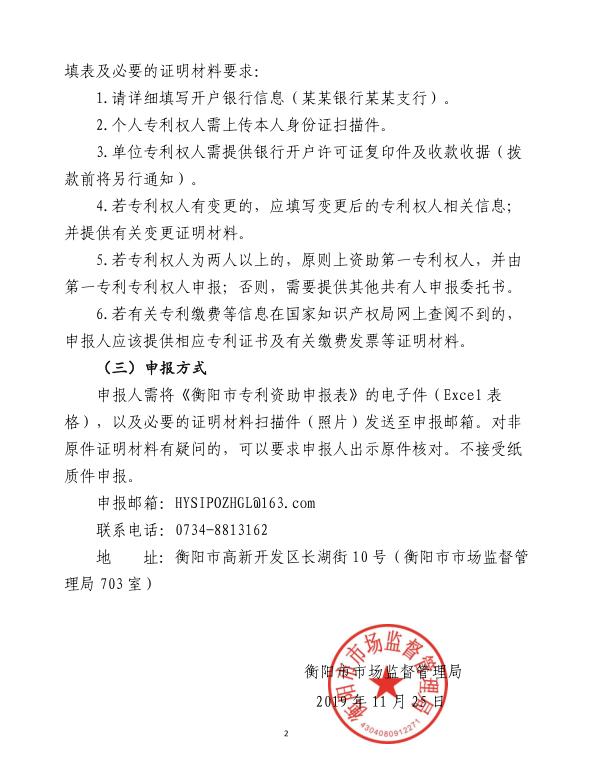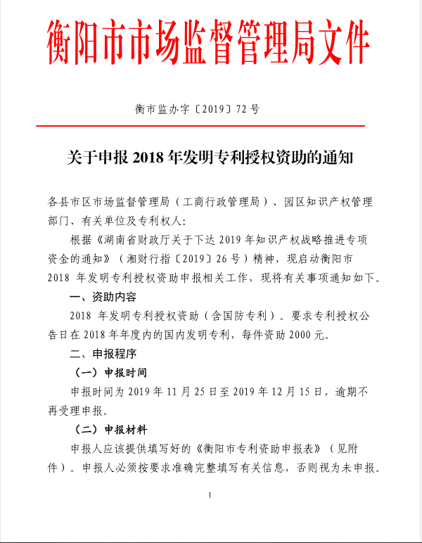 转发:衡阳市市场监督管理局《关于申报 2018 年发明专利授权资助的通知》
