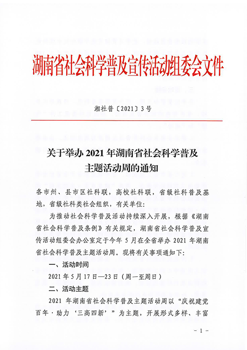 转发:湖南省社会科学普及宣传活动组委会办公室关于举办2021年湖南省社会科学普及主题活动周的通知