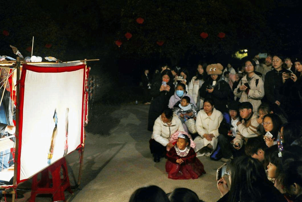 传统文化展示区前龙狮翻飞,喝彩阵阵。皮影戏表演者们唱念做在舞台上跳跃、舞动,光影交错间如同一幅流转的画卷,激荡着千年的韵味。